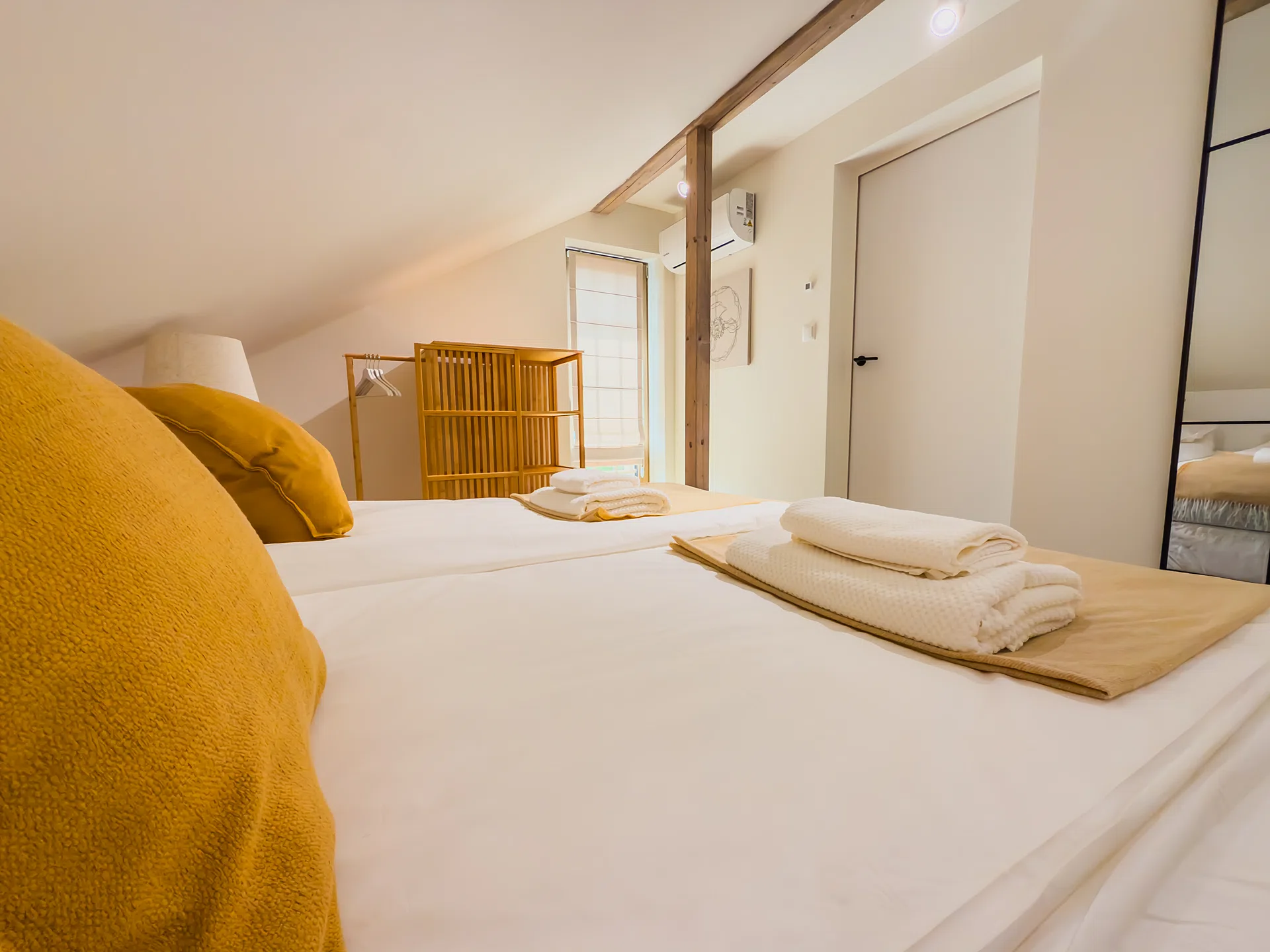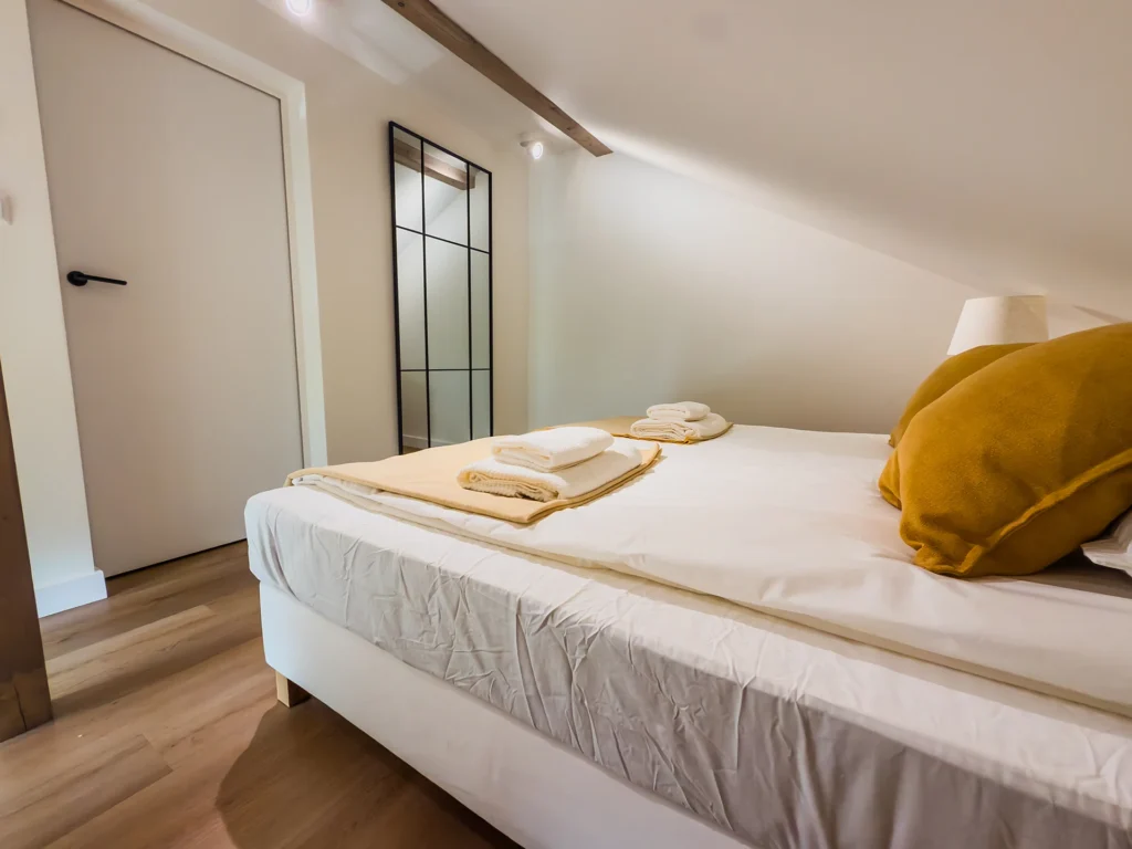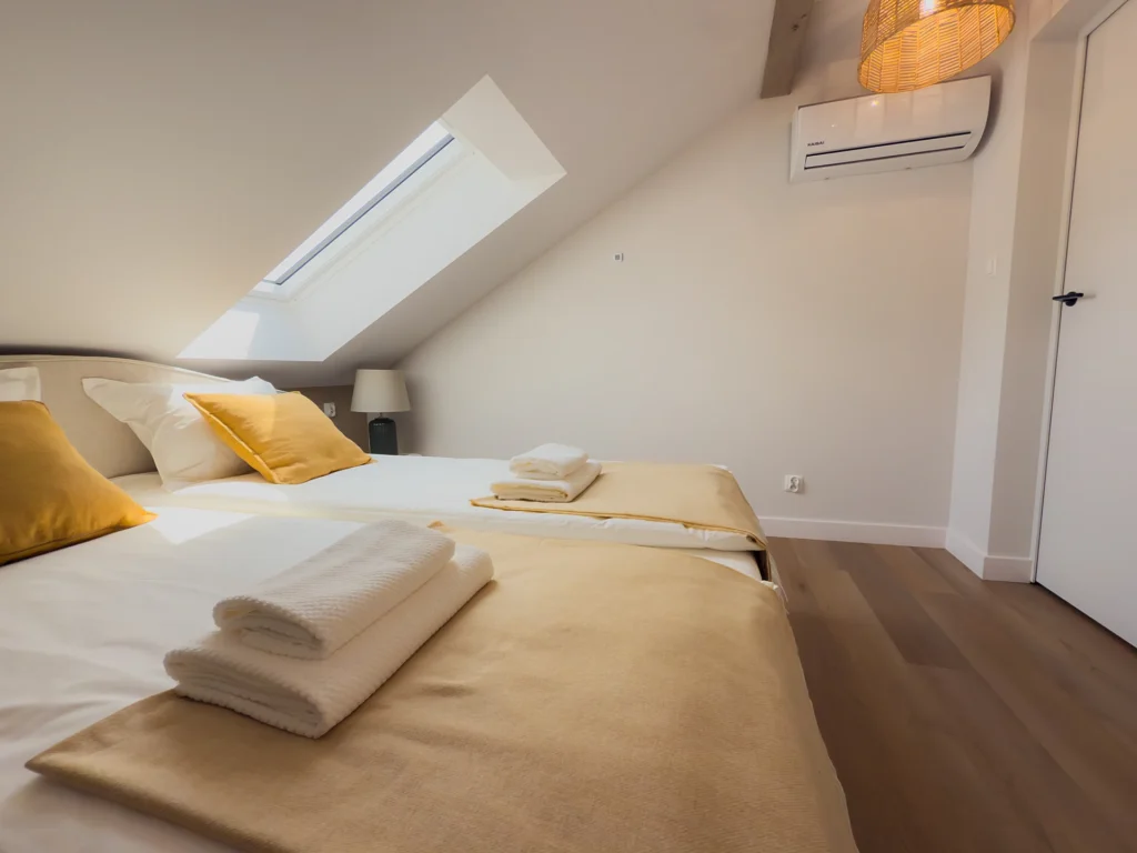 W nowoczesnym i stylowo urządzonym wnętrzu znajdziesz: Wyposażony aneks kuchenny, a w nim: (nowoczesny sprzęt, naczynia, sztućce, garnki, ekspres do kawy, czajnik elektryczny, zmywarkę, piekarnik, lodówkę z zamrażarką), klimatyzację, wygodne sofy, TV oraz stół i krzesła. W części sypialnianej: jedno łóżko małżeńskie, dwa łóżka pojedyncze oraz łazienka z prysznicem, ręcznikami, kosmetykami i suszarką do włosów